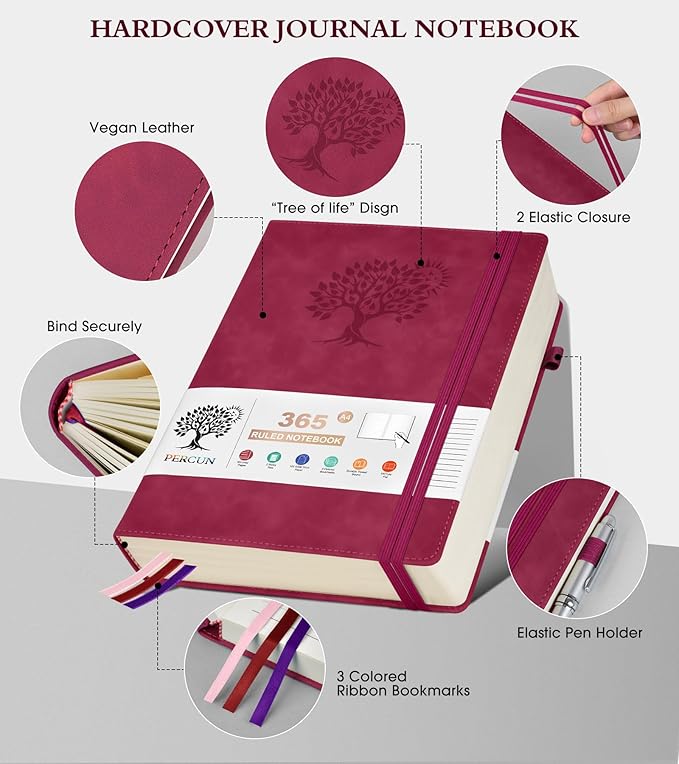 - 【180°Lay Flat for Writing】Our notebook also comes with 180°Lay Flat Journal Notebook, which makes writing a breeze. The elastic pen holder and bookmark ensure that you never lose track of your pen, and the 2 elastic closures ensure that your journal stays securely closed. The 3 colored ribbon bookmarks and 3 sticky labels provide even more ways to customize your journal to your liking.Built-in back pocket that is great for storing loose notes, cards, or other important items.