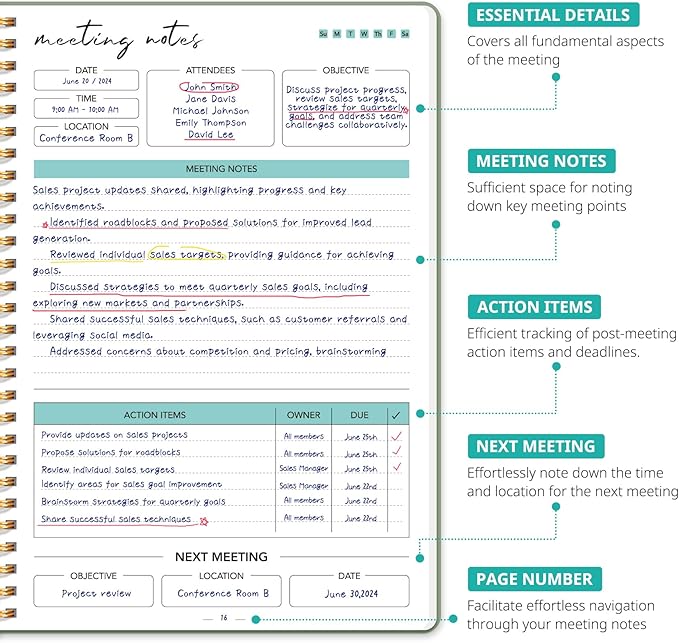 - Boost Meeting Efficiency: A meeting notebook helps you manage and streamline meeting details, ensuring discussions, decisions, and action items are accurately captured and organized. It promotes a more efficient workflow, allowing for easy reference and retrieval of information during and after the meeting.