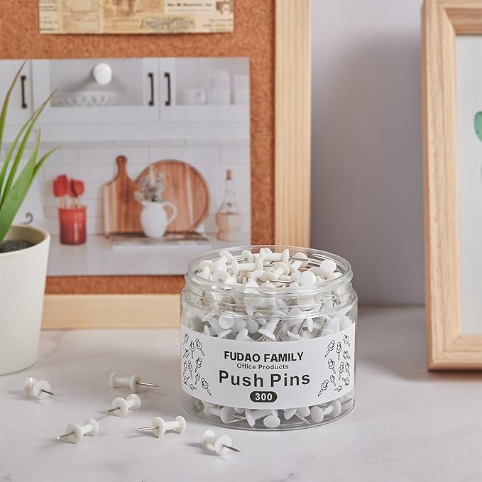 FUDAO FAMILY 300pcs Push Pins for Bulletin Board, Thumb Tacks for Wall Corkboard, Map Pins - Home Office Craft Projects Plastic Head Steel Push Pin (White)