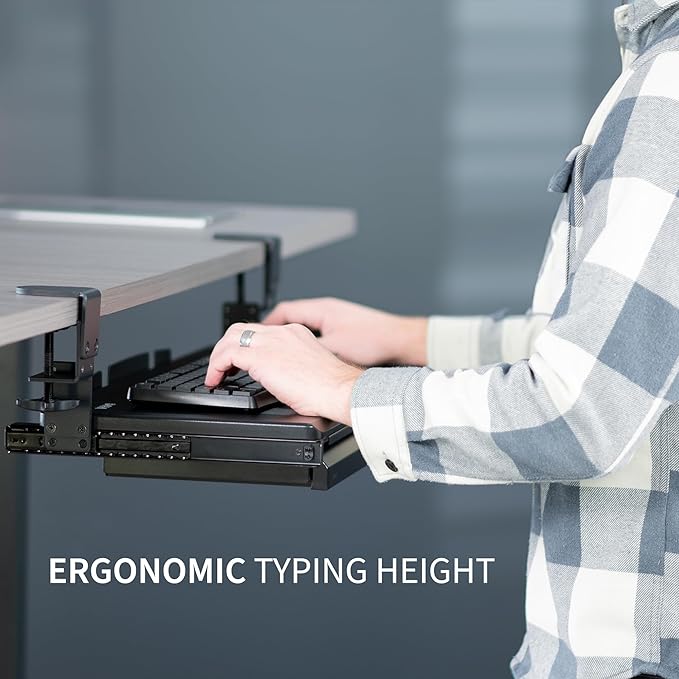 - Height Adjustable for Ergonomic Typing - Both the C-clamps and side brackets are height adjustable for customized tray placement that relieves pressure on your wrists and shoulders. This height adjustment feature also creates more clearance under your desk, accommodating thicker table tops.