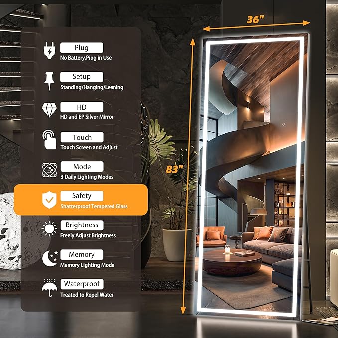 - 【Dimmable & 3 Color Temperature】This lighted full length mirror is multifunctional. You can press the button to change the color temperatures: Warm(3000K), natural (4000K) and white(6000K). You can also dim the brightness to your comfortable level. All these will be easily controlled by the touch button.
