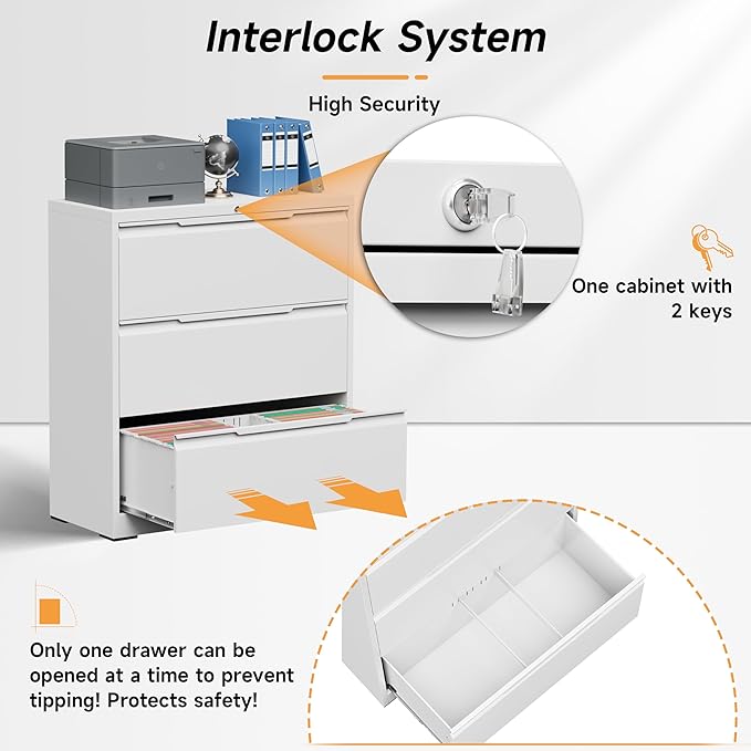 - 🪁【SECURITY SYSTEM】This lateral file cabinet for home office is equipped with one lock and two keys, all drawers can be locked at the same time. Ensure the safety of documents. Provides security for your home and office. This gives you peace of mind when using the filing cabinet!