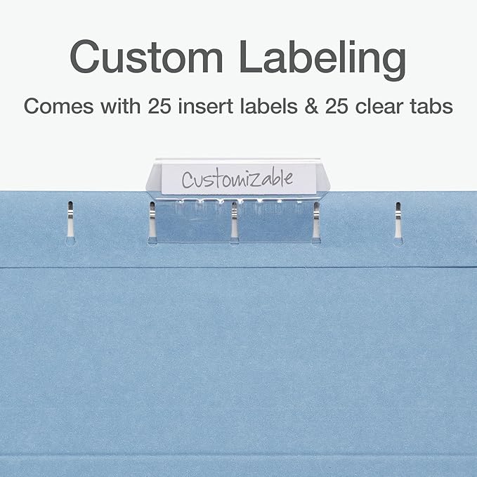 - 1/5 cut hanging file folders come with 25 white paper labels and clear plastic tabs so you can label your files and find things quickly