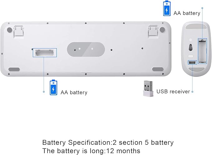 - Longer battery life design: both keyboard and mouse turn into Power-save mode automatically,click any key or button to wake-up within seconds.Each of them runs on one AA battery (NOT included).Low battery indication shows in the top right corner,when the battery is dying,the keyboard's low battery indication light will remind you to replace the battery.