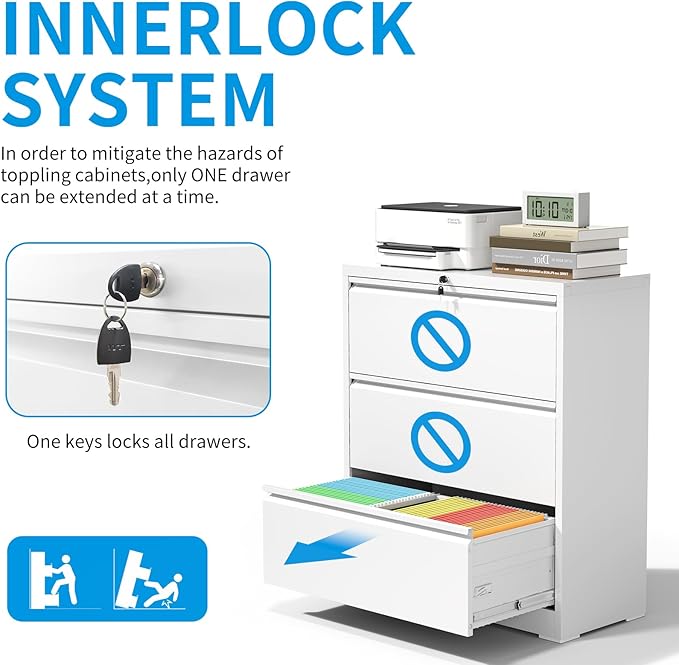 - 【Enhanced Security and Safety】This filing cabinets for home office has one lock and 2 keys, one single lock can secure all the drawers, but interlocking mechanism allows only one drawer to open at a time to add security. Additionally, the anti-tilt device also enhances safety further by fixing the metal filing cabinet to the wall.