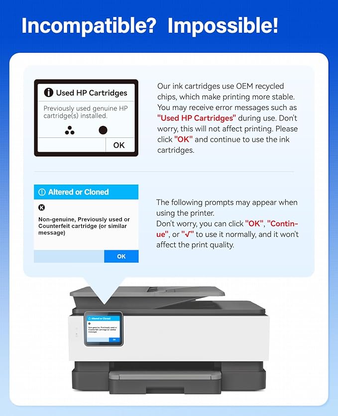 - Note: These are NON-genuine ink cartridges. Your printer may display an ink alert message such as “Non-Original cartridges”. Simply press “Yes”, “Continue”, “Accept” or “OK” to dismiss the prompt