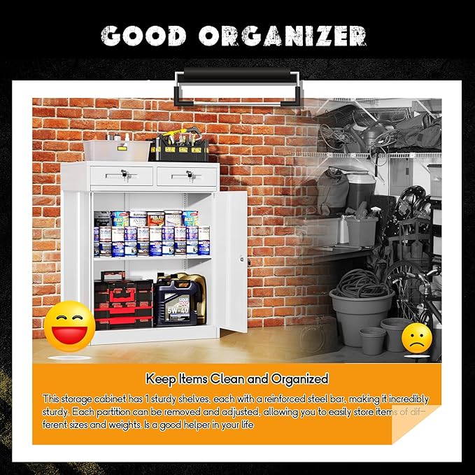 - [π π¨ππ§ππ£π¨π₯π£π’π¦π πππππ‘ππ§] -- Greenvelly locking garage storage cabinets with drawers and adjustable shelves that can be moved up and down according to your needs. Each layer can bear 180 pounds, and the locking metal file cabinet is suitable for storing office documents, tools, and heavy objects. Durable steel cabinets are the best choice for garage, home office, Utility room, schools, stores, warehouses, etc.