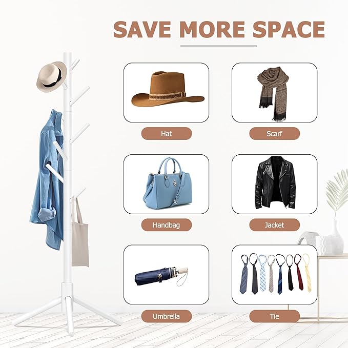 - 【8 Hooks & Save Space】The coat rack with 8 smooth hooks made of high quality New Zealand pine material, which can hang clothes, hats, bags, umbrellas and other items. The solid load-bearing performance is good.