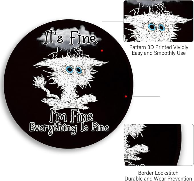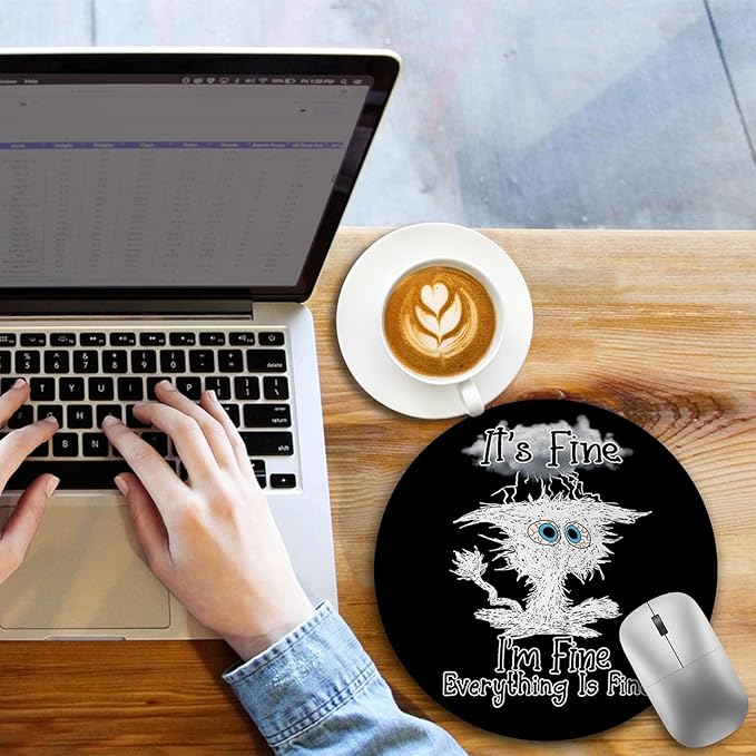 - Awesome Mouse Pad Design: The round mouse pad features a cat with the funny sentence: It's Fine I'm Fine Everything Is Fine, it brings a smile to everyone; A cute and vibrant look gives us a good visual enjoyment for positive emotions in working, studying or gaming, suitable for all style desktop, keyboard, laptop and wireless computer mouse