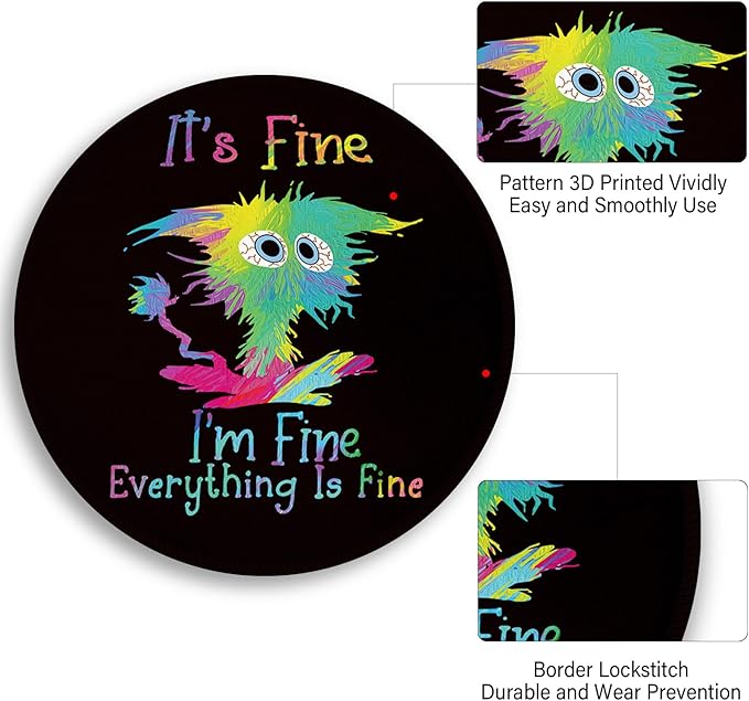 - Awesome Mouse Pad Design: The round mouse pad features a cat with the funny sentence: It's Fine I'm Fine Everything Is Fine, it brings a smile to everyone; A cute and vibrant look gives us a good visual enjoyment for positive emotions in working, studying or gaming, suitable for all style desktop, keyboard, laptop and wireless computer mouse