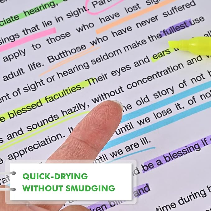 - SAFE AND COMFORTABLE: non-toxic, odor-free, acid-free. Highlighter quality meets MSDS, ASTM, EN71 D-4236 standards. The narrow barrel shape of the highlighter provides a safe utensil and comfortable grip for both children and adults.
