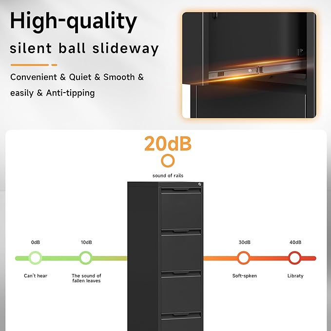 - 🧩【SMOOTH MUTE SLIDE RAILS】: Our metal file cabinets are made with full retractable mute slide rails, open and close smoothly, easy to pick up and put down folders without noise. Perfect for office, home and school use. And the vertical appearance design can maximize the effective use of space, so that your space is not wasted!