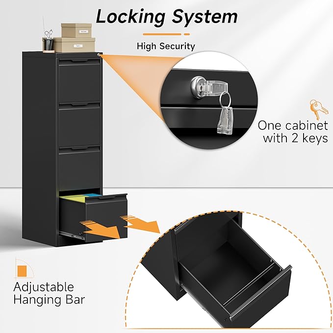 - 🧩【SUPER FUNCTIONAL VERTICAL FILING CABINET】: Our this file cabinet has four large drawers with 15.7 inches depth, which provides you with large enough storage space. And it is equipped with adjustable hanging rods to store different types of files, such as letter, legal, A4, F4 size folders. It is perfect for you to customize the way you organize your files!