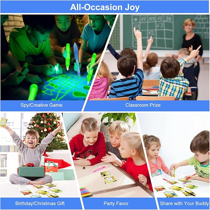 - All-Occasion Gift Set: these invisible ink pen will be a hit at birthday parties, Classroom prize, Halloween treats, or Christmas stocking stuffers, Goodie bag stuffers, these UV pen sets are the go-to for educational and fun party favors. Great for the end of school year gift for the whole class