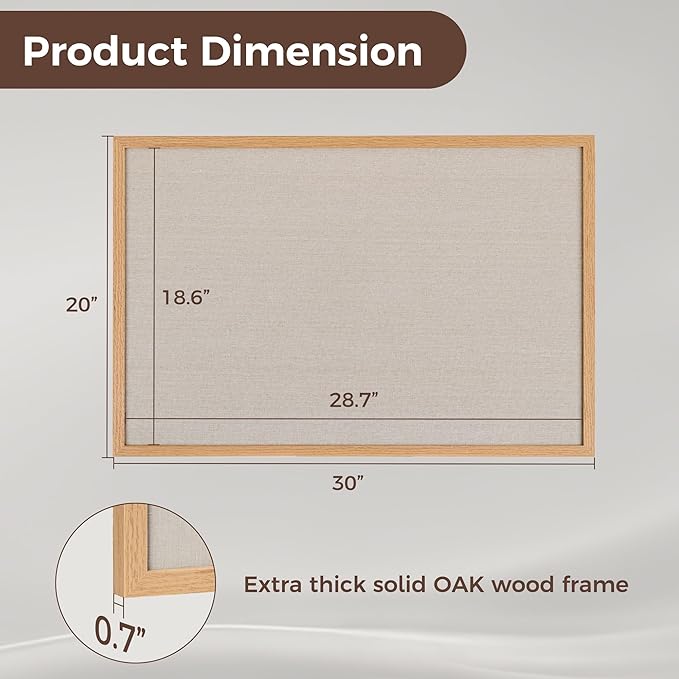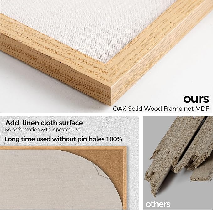 - Oak Frame Material: Our cork boards for walls is made of 100% pine wood which has well self-healing ability and repairability. The pin board features a four-ply splint design that is strong and thick enough not to be punctured by thumbtacks.