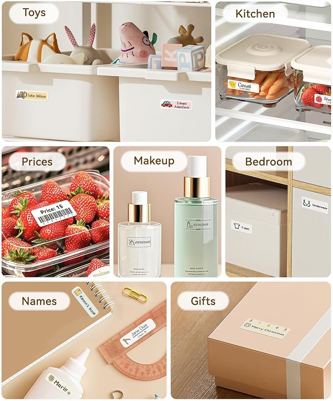 - 【Ideal Gifts】The NIIMBOT D110 Sticker Printer Machine is used widely in organizing home supplies - storage, food date marking, classifying cosmetics items, jar stickers; School name labels, study note and office files classification, cable identification, personal item identification, name tags; Small business - price tags, jewelry tags and more.