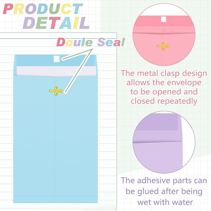 - Practical Sealing Mechanism: the metal clasps together with moisture activated gluing provide a secure grip and make the envelope easy to open and close repeatedly without damaging the content inside; The sealing mechanism ensures your documents stay safe and protected during handling