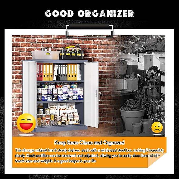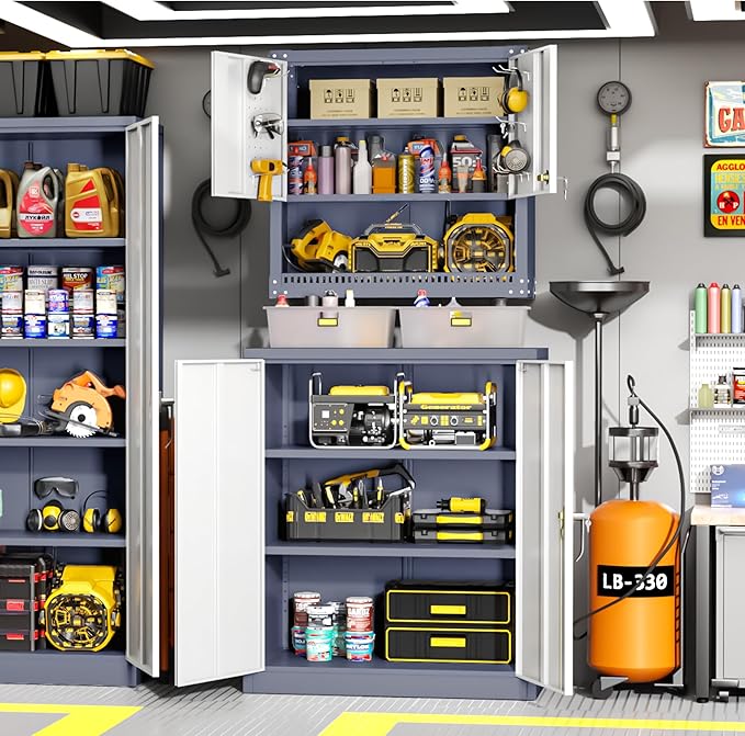 - [Excellent Material&Durability]:Greenvelly metal locking cabinet with doors and shelves is made up of 0.88mm cold-rolled steel plate.The surface of metal garage storage cabinet is coated with anti-corrosion and anti-rust coating,which makes it more durable and suitable for indoor and outdoor scenes,such as office,garage,home,school.