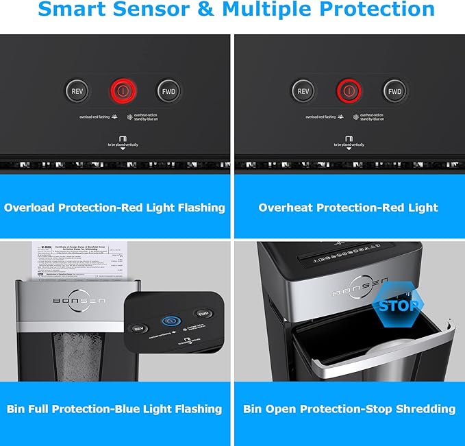 - User-Friendly Design: Convenient buttons (Power on, Forward, Reverse) and clear LED indicators show standby/ overheat / overload / bin full / bin open status; This enables you to use this paper shredder for office correctly and find problems in time