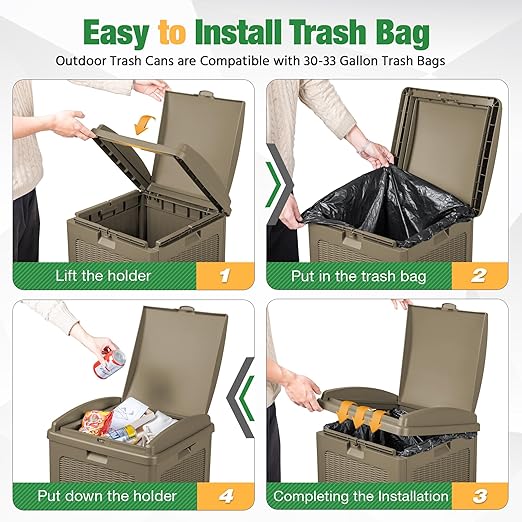- Easy to Install Trash Bags: The waste bin for outdoors is compatible with 30-33 gallon trash bags. You need to lift the trash bag holder, put on the trash bag, put down the holder, and then finish the installation. After opening the inner lid, the garbage bag can be stably fixed in the card slot.