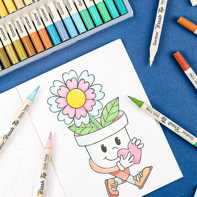 - Experience the versatility and vibrancy of the Grabie 2-in-1 acrylic marker Set. With dual-color brush tips, this innovative design offers a wide range of colors in one convenient set. Crafted with premium acrylic paint, these markers are non-toxic, quick-drying, and perfect for any surface. Whether on paper, stone, glass, or beyond, Grabie markers deliver bold, vivid colors and superior performance with every stroke