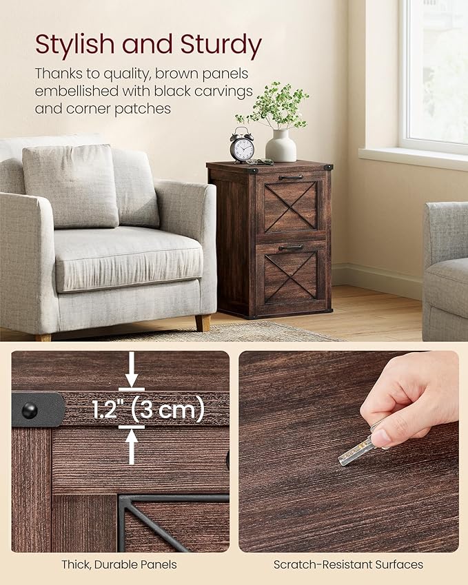 - [Charming Farmhouse Style] Bring the farmhouse charm to your home with this file cabinet. Its unique maroon brown color and barn doors are sure to liven up any office, study, or even bedroom as a nightstand!