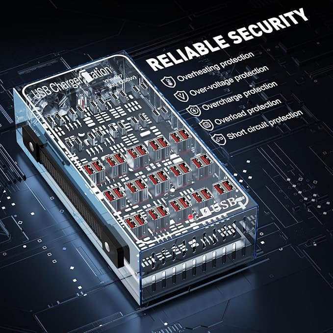 - [Safe and practical]: The 50 port charging station supports USB C port, USB A port output, and BC1.2. Although it has more power, this charger is designed with a multi-layered protection system to ensure your devices are protected from overheating, overcharging, and short circuits. Upgrade your charging experience to new levels of convenience and efficiency