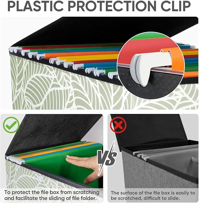 - [UNIVERSAL SIZE] Our file box with lid fits letter-sized files. It is designed for efficiency and functionality, with its smooth PVC slide rails on both sides, you can effortlessly slide file folders for easy access and neatly arranged. The lid fits snugly on the box after hanging folders. (NOTE: file folders are not included)