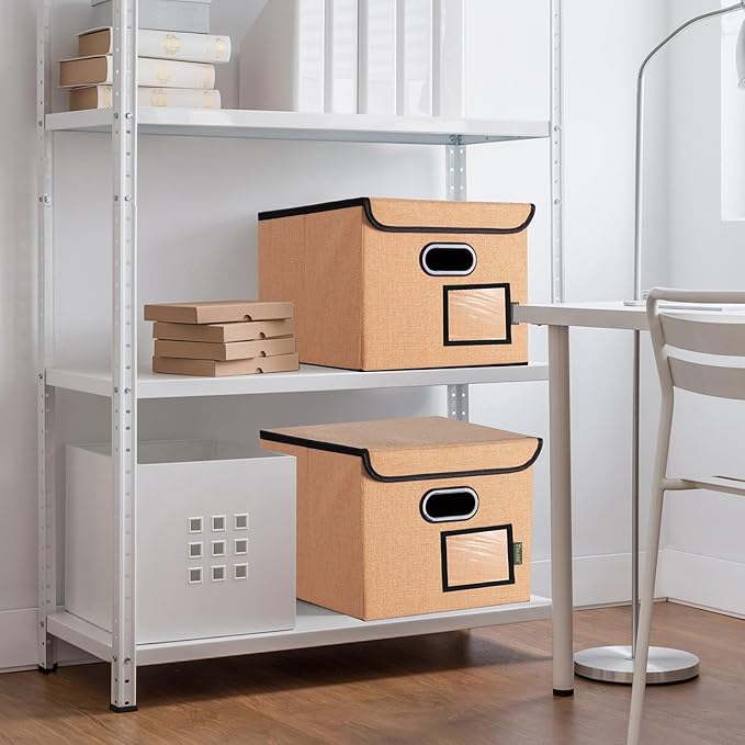 - [DURABLE MATERIAL] The outer layer of our filing box is crafted from high-quality polyester fabric and reinforced with thick cardboard in the middle. This construction ensures that the box maintains its shape and provides better bearing capacity for important documents and files. Its textured appearance can also serve as a stylish decorative element in any office or home.