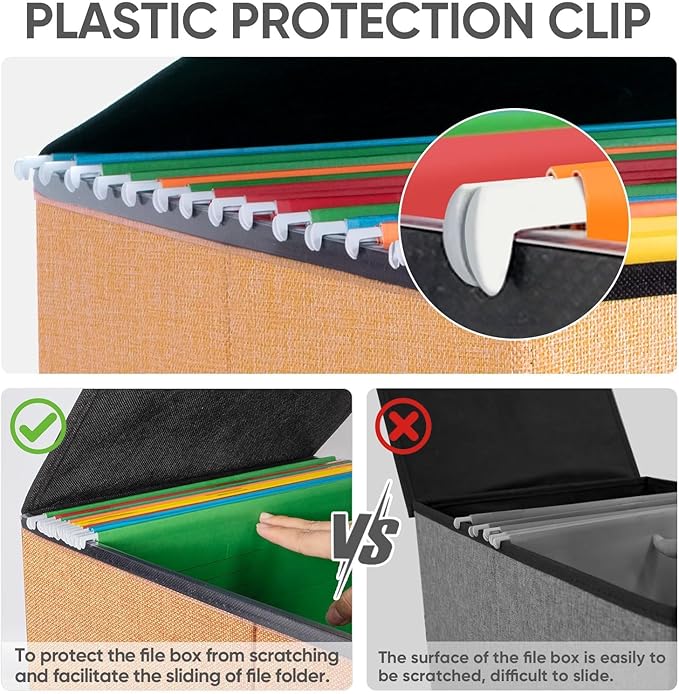 - [UNIVERSAL SIZE] Our file box with lid fits letter-sized files. It is designed for efficiency and functionality, with its smooth PVC slide rails on both sides, you can effortlessly slide file folders for easy access and neatly arranged. The lid fits snugly on the box after hanging folders. (NOTE: file folders are not included)