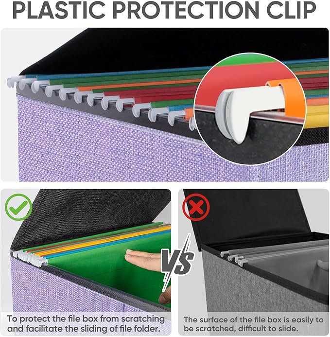 - [UNIVERSAL SIZE] Our file box with lid fits letter-sized files. It is designed for efficiency and functionality, with its smooth PVC slide rails on both sides, you can effortlessly slide file folders for easy access and neatly arranged. The lid fits snugly on the box after hanging folders. (NOTE: file folders are not included)