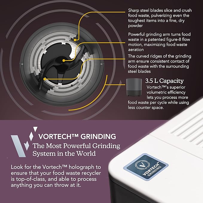 - INNOVATIVE VORTECH SYSTEM: The Eco 3βs Vortech(TM) patented grinding system can grind what others can't, so go ahead and toss in your pits, peels, bones, leftovers! Vortech's efficiency means the FoodCycler consumes less power than your average clothes dryer.