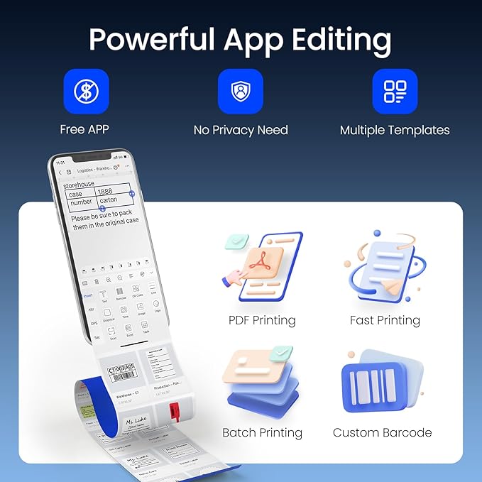 - Free and Powerful App: Experience fast and secure printing with our app, which requires no login or privacy permissions. Effortlessly customize your output with a wide array of free icons, fonts, and frames. Print text, barcodes, QR codes, tables, images, logos, and more with ease. Utilize various label templates along with batch printingοΌscan priting and PDF printing options to enhance your efficiency. Ideal for both small businesses and home use.
