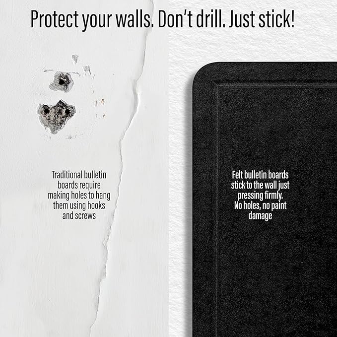 - EASY TO INSTALL, SAFE FOR WALLS β This bulletin board uses a hook and loop system to attach securely to the felt board, paired with a strong adhesive backing that sticks to your wall. Setup is quick, clean, and damage-freeβno tools, glue, or nails required. Safe for homes, classrooms, and offices, this black cork board makes mounting effortless.