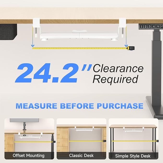 - Universal - This 20" (24.2" including clamps) x 11.8" under-desk keyboard tray holds your small keyboard, mouse, and other small accessories below the desktop to add work space. Please not it does NOT fit if your desk thickness is over 1.57β.