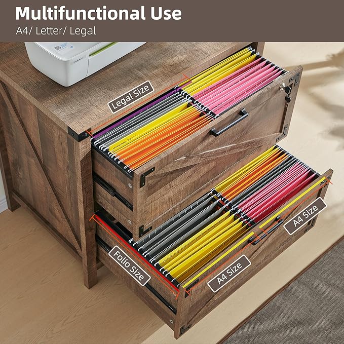- Stylish Farmhouse Design: This unique farmhouse file cabinet blends modern functionality with farmhouse charm, making it the perfect addition to any home office. The farmhouse-inspired design adds a touch of elegance to any home office decor, and complements various interior styles, creating a harmonious and appealing workspace ambiance.(New upgrade: resized and with locking function)
