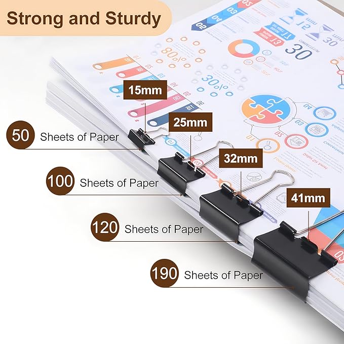 - Assorted Sizes: Includes 100 black metal binder clips in 4 sizes - 15mm (mini) x 75 pcs, 25mm (small) x , 32mm (medium), and 41mm (large) - for various paper clipping needs.