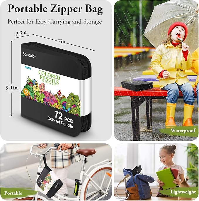 - WHAT YOU GET -- 72 colored pencils + 1 Soucolor Portable Zipper Case. Convenient to storing and keep the color all visible, without any trouble finding the color you are looking for. Perfect for sketchbook, drawing book or adult coloring book.