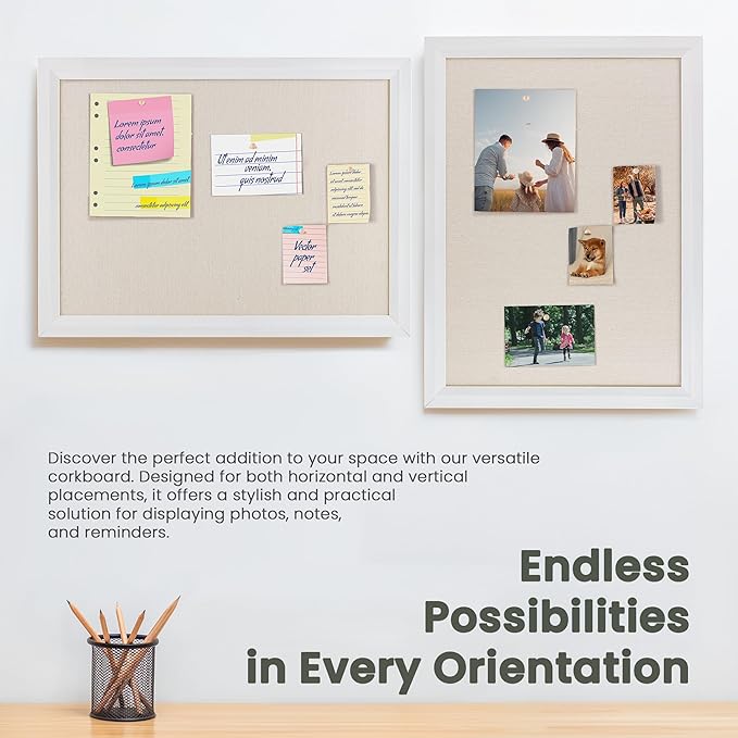 - Premium Solid Wood Frame: Cork board with a solid wood frame measuring 1.38" in width. This sturdy construction ensures durability and longevity, providing a reliable display solution for your photos, notes, and reminders. Its elegant design adds a touch of sophistication to any space, making it a versatile and stylish addition to your home or office decor.