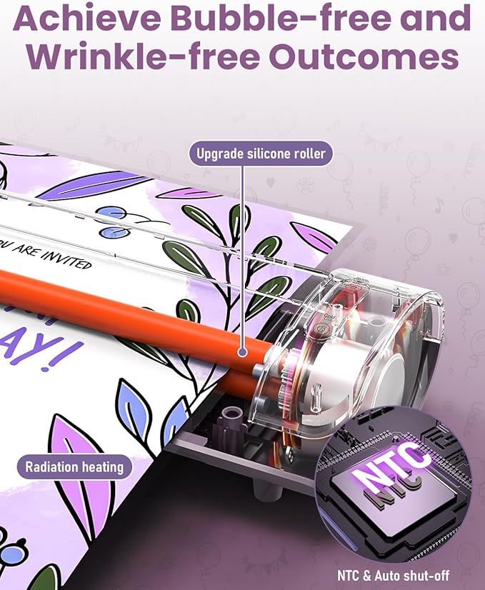 - Create Smooth Projects: This personal laminator for teachers uses NTC real-time temperature control to ensure uniform heating of the rollers, which can effectively avoid the problem of uneven heating leading to blurred and unclear finished products. Your important projects will have a smooth, vibrant, and durable finish. Additionally, this personal laminator features an auto shut-off function, turning off after 45 minutes of inactivity to save energy and prolong its lifespan