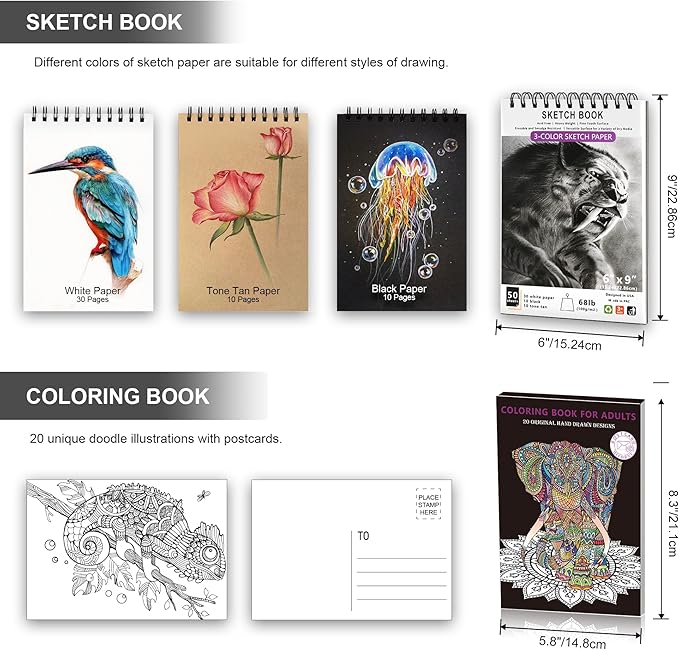 - Unique 3-Color Sketchbook and Coloring Book: 6 x 9", 100GSM, 50 Pages (30 pages white, 10 pages toned tan, 10 pages black) - Different colors of sketch paper are suitable for different styles of drawing, one sketchbook can meet your needs for different colors of sketch paper, no need to spend more money to buy different colors of sketchbooks.A5 coloring book,160GSM,20 unique doodle illustrations,premium paper accepts a variety of coloring tools.Each illustration also is a postcard that can be mailed anywhere as long as it is stamped.