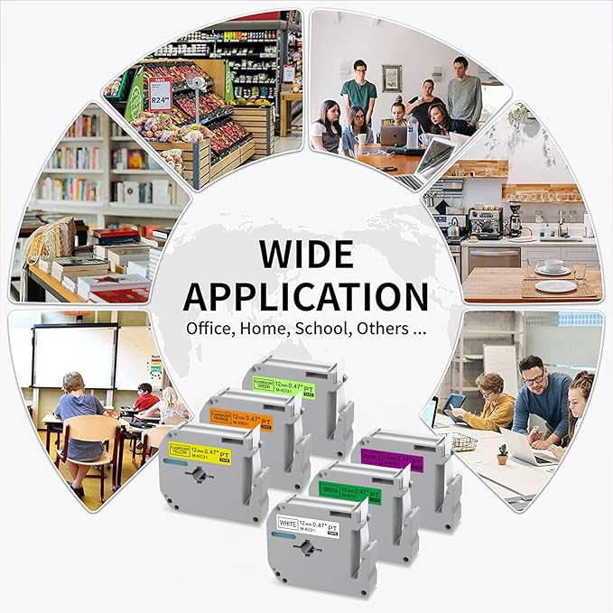 - PACKAGE CONTENTS of REPLACEMENT BROTHER LABEL MAKER COLORED M TAPES: 6Pack compatible with Brother ptouch M series color tape. Color: 12mm 0.47 M-K M-K231 M-KC31 M-KD31 M-KB31 M-KP31 M-KBL31 labeler tapes are available in Black on White/Fluorescent Yellow/Fluorescent Green/Fluorescent Orange/Fuchsia/Lake blue, allowing you to choose the right color for your labeling needs, Width: 1/2" (12mm) each. Length: 26.2' (8m) each.