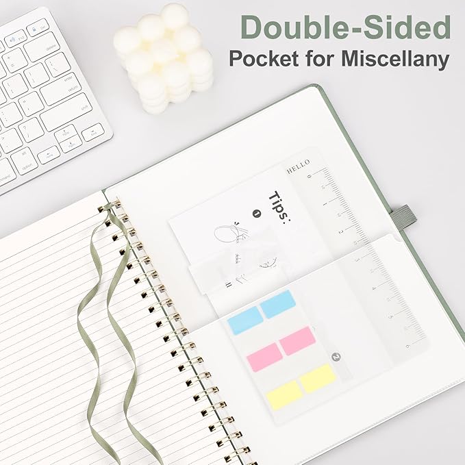 - PRACTICAL LAYOUT: Equipped an elastic band, a pen holder and removable bookmark ruler to keep your notebook organized. Comes with a DIY bookmark with a ribbon for self-attachment to the spiral, serving as a bookmark. Features a double-sided pocket for storing miscellany and 18pcs sticky notes for additional organization and reminders