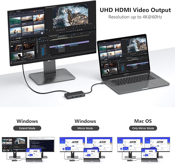 - Dual 4k Resolution Output: HDMI1/DP max up to 4K@60Hz, HDMI2 up to 4K@30Hz(work separately while source is DP1.4). When dual displays, HDMI1 or DP will be 4K@60Hz and HDMI2 up to 4K@59Hz(DP1.4). When using 2 hdmi+DP, HDMI1 up to 4K@59Hz, DP up to 4K@29Hz, HDMI2 up to 2K@60Hz(DP1.4).Display output will be 1080P when multiple monitor with VGA. Note!!! When using daul hdmi+DP, must follow the sequence or it will fail: Plug in HDMI1βPlug in DP(wait for the screen to display successfully)βPlug in HDMI2