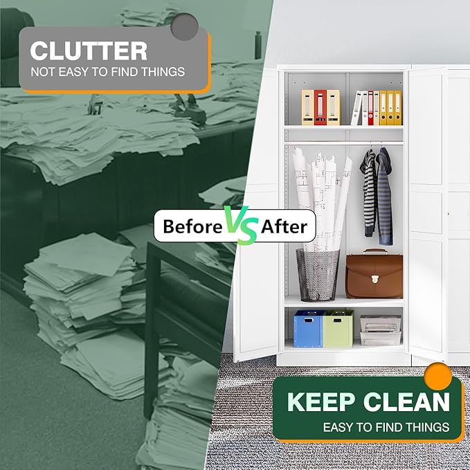 - Spacious and Flexible Storage: 72HΓ36WΓ18D. This tall wardrobe has a large interior with a dedicated hanging rod area and adjustable shelves. The large storage capacity allows you to organise clothes, accessories, office supplies and more, increasing the functionality and flexibility of your space.