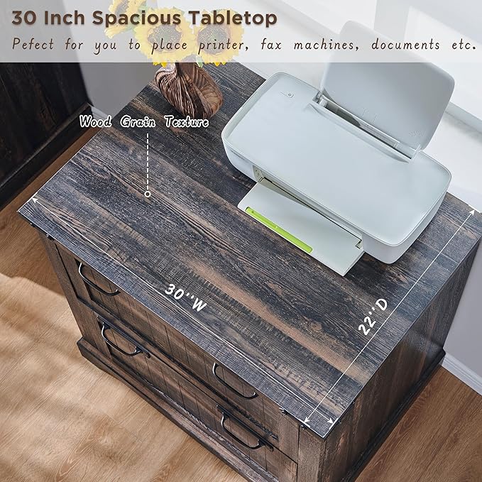 - 30 Inch Spacious DesktopοΌThis office filing cabinet is a powerful assistant for your efficient work. 30 inches spacious desktop has a rustic finish with a delicate touch, being stain-resistant and easy to clean. No matter if you use it intensively for a long time or accidentally cause bumps or water spills, it will always remain aesthetically pleasing and practical.
