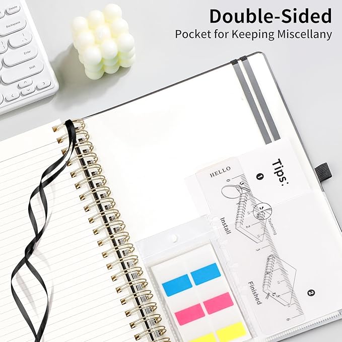 - Lined Journal Additional Features: The lined notebook includes sticky notes, 1 DIY ribbon bookmark, a double-sided PVC back pocket, 1 pen holder, 1 removable ruler, 2 Elastic bands, and a humane rounded arc corner design