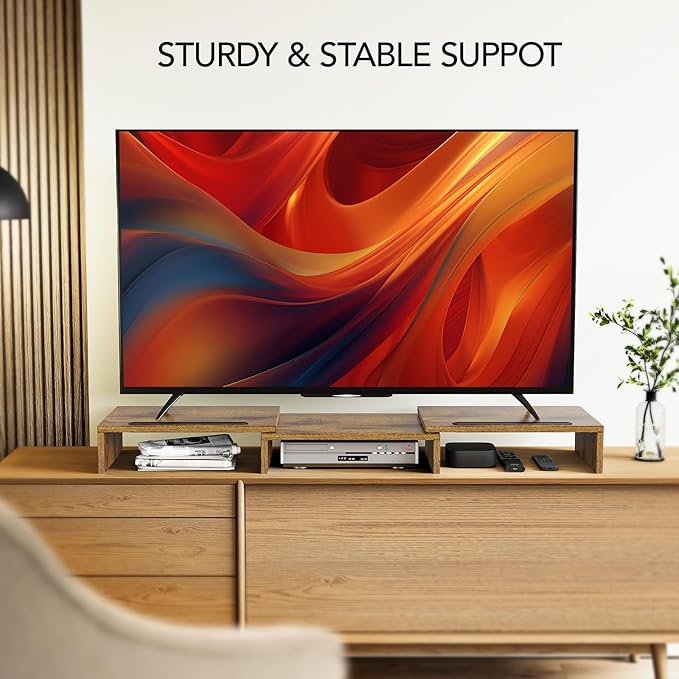 AMERIERGO Dual Monitor Stand Riser- 3 Shelf Screen Stand with Adjustable Length and Angle, 2 Extra Functional Slot Desktop Organizer Stand for PC, Computer, Laptop (Rustic Brown)