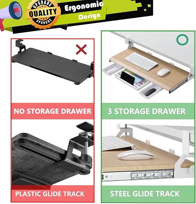 - Maximize Desk Space & 3 Drawers - The ETHU keyboard tray is designed to save desk space with its 26.77” (31.18" with clamps) x 12.2” size, allowing you to fit your keyboard, mouse, and small accessories beneath your desktop. Underneath the keyboard, 3 drawer storage adds valuable extra workspace for your phone and other items
