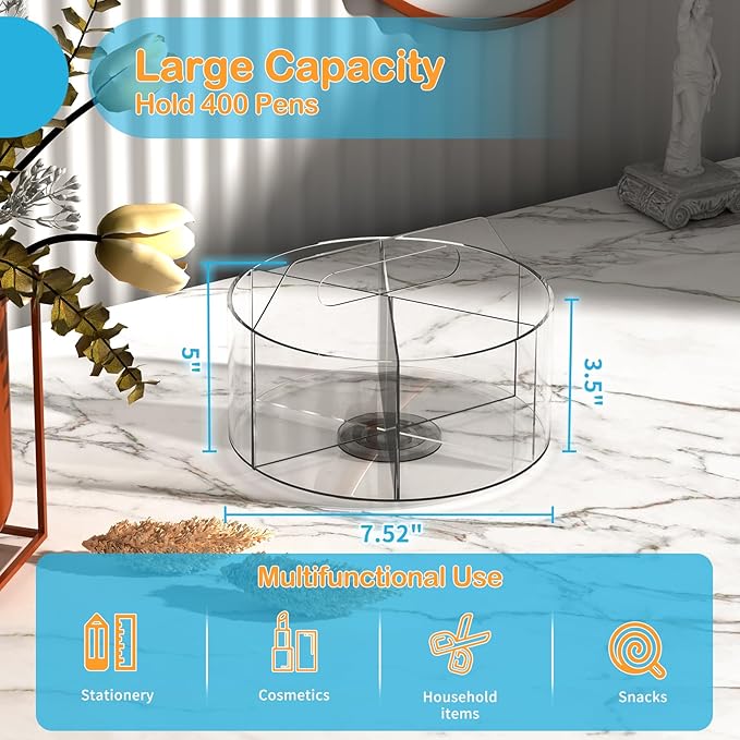 - Large Capacity Spinning Desk Organizer: Good size diameter: 7.52", height: 3.5". This acrylic pen holder is divided into 6 compartments, you can sort different types of pens, pencils, crayons, highlighters, markers, art supplies, etc into different sections. You can maximize the use of space with our 360° rotating acrylic office supply organizer. Mefirt rotating desk organizer, get everything organized!
